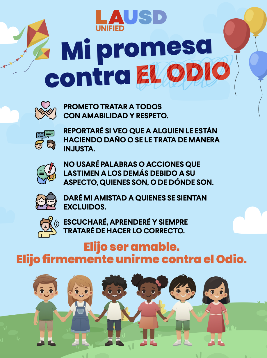 We encourage you to speak with your child about the importance of standing up for themselves and others, and of embracing differences that make our community stronger. Use the Parent Call to Action resource to help you get the conversation started. Have your child share the Pledge Against Hate.