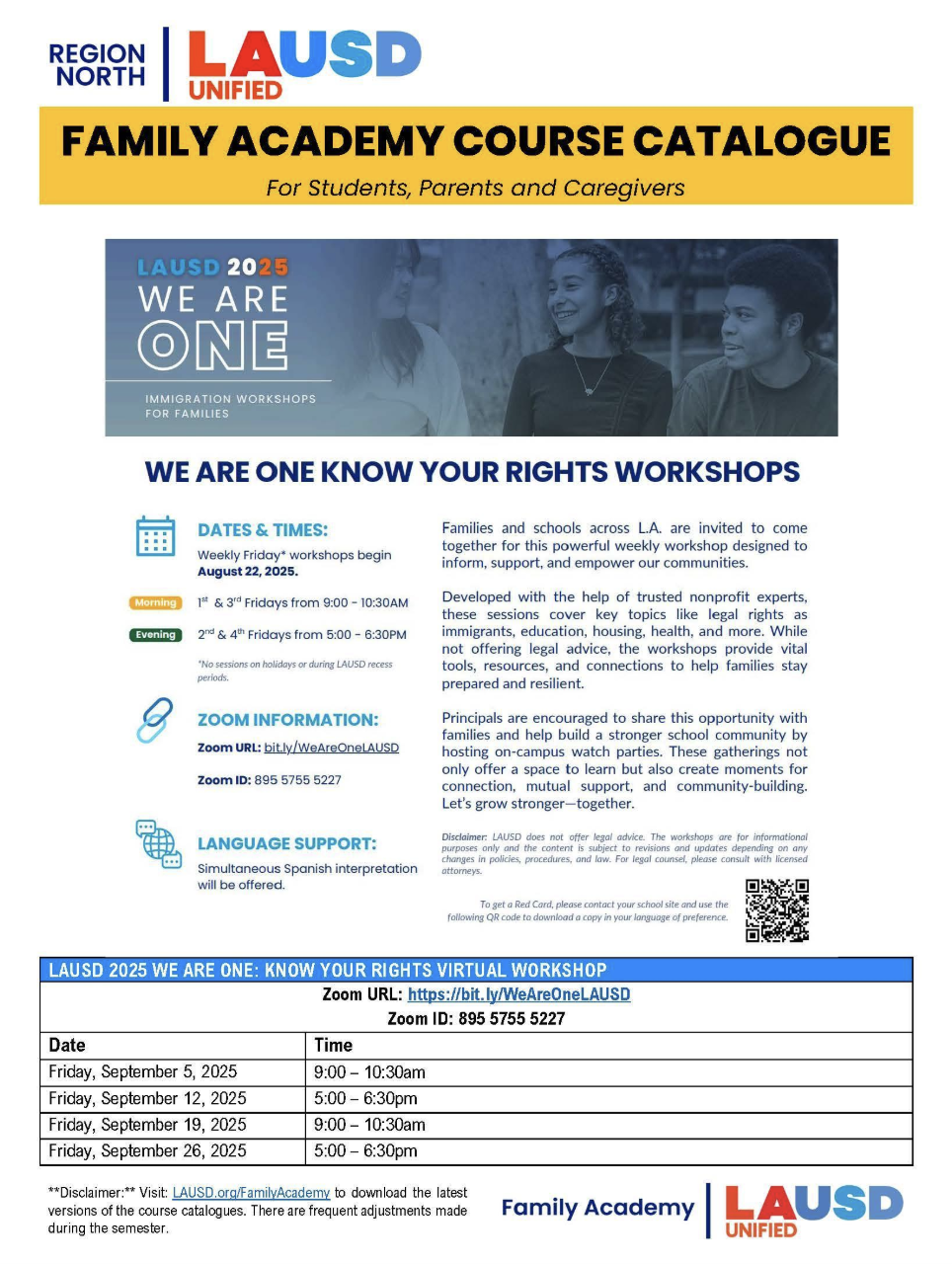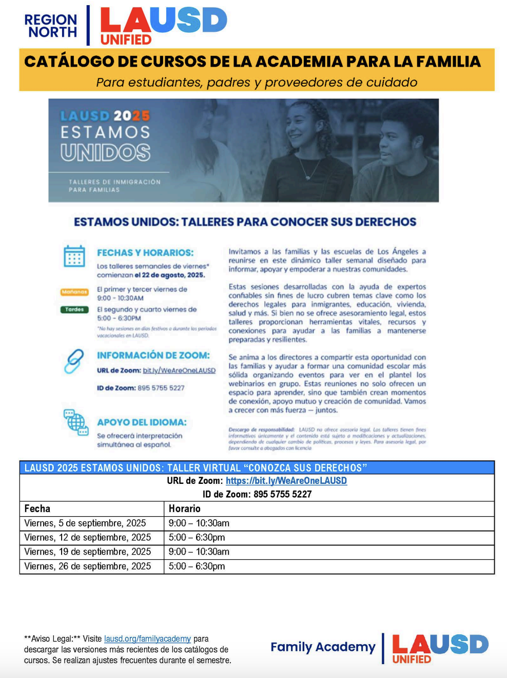 LAUSD families are invited to join a weekly workshop series designed to inform, support, and empower our communities. Developed with trusted nonprofit partners, these sessions cover important topics like immigrant rights, education, housing, and health. While not offering legal advice, they provide valuable resources and connections to help families stay informed and resilient.